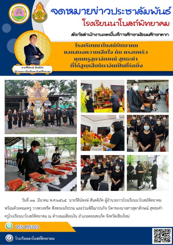 วันที่ ๓๑ มีนาคม พ.ศ.๒๕๖๕ นายรัติน์พงษ์ สันตติภัค ผู้อำนวยการโรงเรียนนาโบสถ์พิทยาคม พร้อมด้วยคณะครู วางพวงหรีด ฟังพระอภิธรรม และร่วมพิธีฌาปนกิจ บิดาของนางสาวสุดาลักษณ์ สุทธะคำ ครูโรงเรียนนาโบสถ์พิทยาคม ณ ตำบลแม่ฮ้อยเงิน อำเภอดอยสะเก็ด จังหวัดเชียงใหม่