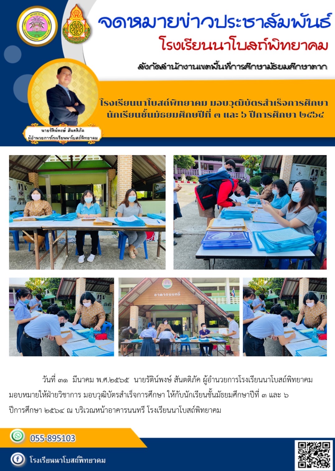 วันที่ ๓๑ มีนาคม พ.ศ.๒๕๖๕ นายรัติน์พงษ์ สันตติภัค ผู้อำนวยการโรงเรียนนาโบสถ์พิทยาคม มอบหมายให้ฝ่ายวิชาการ มอบวุฒิบัตรสำเร็จการศึกษา ให้กับนักเรียนชั้นมัธยมศึกษาปีที่ ๓ และ ๖ ปีการศึกษา ๒๕๖๔ ณ บริเวณหน้าอาคารนนทรี โรงเรียนนาโบสถ์พิทยาคม