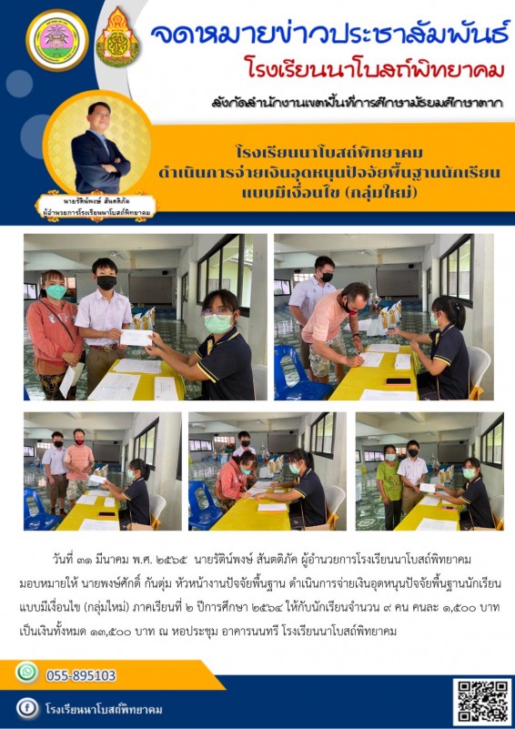วันที่ ๓๑ มีนาคม พ.ศ. ๒๕๖๕ นายรัติน์พงษ์ สันตติภัค ผู้อำนวยการโรงเรียนนาโบสถ์พิทยาคม มอบหมายให้ นายพงษ์ศักดิ์ กันตุ่ม หัวหน้างานปัจจัยพื้นฐาน ดำเนินการจ่ายเงินอุดหนุนปัจจัยพื้นฐานนักเรียน แบบมีเงื่อนไข (กลุ่มใหม่) ภาคเรียนที่ ๒ ปีการศึกษา ๒๕๖๔ ให้กับนักเ