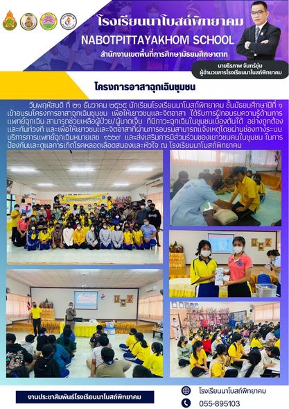 วันพฤหัสบดี ที่ ๒๑ ธันวาคม ๒๕๖๕ นักเรียนโรงเรียนนาโบสถ์พิทยาคม ชั้นมัธยมศึกษาปีที่ ๑ เข้าอบรมโครงการอาสาฉุกเฉินชุมชน เพื่อให้เยาวชนและจิตอาสา ได้รับการฝึกอบรมความรู้ด้านการแพทย์ฉุกเฉิน สามารถช่วยเหลือผู้ป่วย/ผู้บาดเจ็บ ที่มีภาวะฉุกเฉินในชุมชนเบื้องต้นได้ อย่างถูกต้องและทันท่วงที เเละเพื่อให้เยาวชนและจิตอาสาที่ผ่านการอบรมสามารถแจ้งเหตุโดยผ่านช่องทางระบบบริการการเเพทย์ฉุกเฉินหมายเลข ๑๖๖๙ และส่งเสริมการมีส่วนร่วมของเยาวชนคนในชุมชน ในการป้องกันและดูแลการเกิดโรคหลอดเลือดสมองและหัวใจ ณ โรงเรียนนาโบสถ์พิทยาคม |