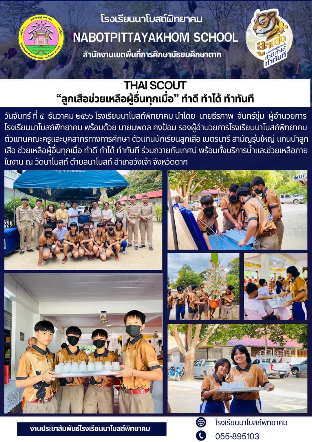 วันจันทร์ ที่ ๔ ธันวาคม ๒๕๖๖ โรงเรียนนาโบสถ์พิทยาคม นำโดย นายธีรภาพ จันทร์ชุ่ม ผู้อำนวยการโรงเรียนนาโบสถ์พิทยาคม พร้อมด้วย นายนพดล คงป้อม รองผู้อำนวยการโรงเรียนนาโบสถ์พิทยาคม ตัวแทนคณะครูและบุคลากรทางการศึกษา ตัวแทนนักเรียนลูกเสือ เนตรนารี สามัญรุ่นใหญ่ แกนนำลูกเสือ ช่วยเหลือผู้อื่นทุกเมื่อ ทำดี ทำได้ ทำทันที ร่วมถวายกันเทศน์ พร้อมทั้งบริการน้ำและช่วยเหลือภายในงาน ณ วัดนาโบสถ์ ตำบลนาโบสถ์ อำเภอวังเจ้า จังหวัดตาก |