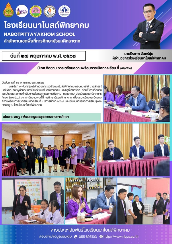 วันอังคาร ที่ ๒๘ พฤษภาคม พ.ศ. ๒๕๖๘ นายธีรภาพ จันทร์ชุ่ม ผู้อำนวยการโรงเรียนนาโบสถ์พิทยาคม มอบหมายให้ นายสกรรจ์ มณีเขียว รองผู้อำนวยการโรงเรียนนาโบสถ์พิทยาคม เเละครูที่เกี่ยวข้อง ร่วมให้การต้อนรับเเละนำเสนอผลการดำเนินงานต่อคณะกรรมการติดตาม ตรวจสอบ ประเมินผลและนิเทศการศึกษา (ก.ต.ป.น.) จากสำนักงานเขตพื้ที่การศึกษามัธยมศึกษาตาก เพื่อตรวจเยี่ยมและติดตามความพร้อมการเปิดเรียน ภาคเรียนที่ ๑ ปีการศึกษา ๒๕๖๘ และเยี่บมชมการจัดการเรียนรู้ของ