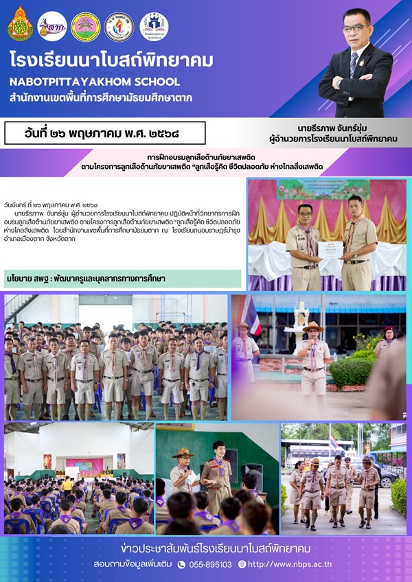 วันจันทร์ ที่ ๒๖ พฤษภาคม พ.ศ. ๒๕๖๘ นายธีรภาพ จันทร์ชุ่ม ผู้อำนวยการโรงเรียนนาโบสถ์พิทยาคม ปฏิบัติหน้าที่วิทยากรการฝึกอบรมลูกเสือต้านภัยยาเสพติด ตามโครงการลูกเสือต้านภัยยาเสพติด “ลูกเสือรู้คิด ชีวิตปลอดภัย ห่างไกลสิ่งเสพติด โดยสำนักงานเขตพื้นที่การศึกษามัธยมตาก ณ โรงเรียนถนอมราษฎร์บำรุง อำเภอเมืองตาก จังหวัดตาก |